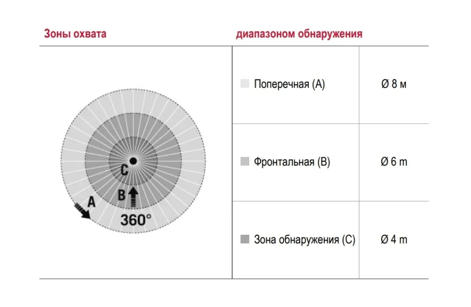 • Зона обнаружения 8 м в диаметре при рекомендованной монтажной высоте 3 м (максимальная монтажная высота 5 м) для установки в небольших помещениях, проходах, туалетах, небольших офисах или прихожих с отсутствием или малой долей естественного освещения