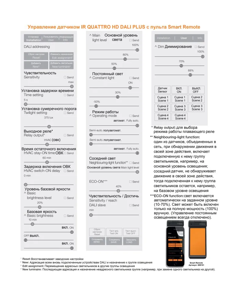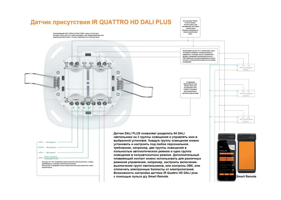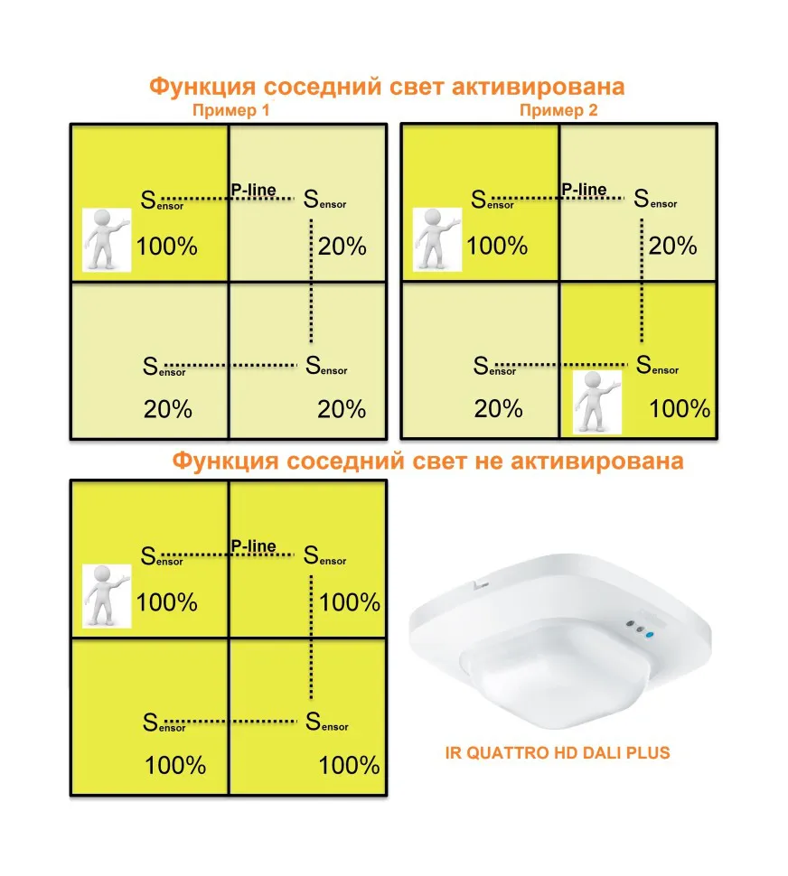 Классная комната, офис открытой планировки или офис для одного человека. Наш датчик присутствия IR Quattro HD DALI plus - это простой способ получить эффективные результаты. Модуль управления освещением, установленный в грузовой секции, делает установку быстрой и легкой. Используя Smart Remote, вы можете управлять до 64 светильниками через 3 канала освещения через приложение (с адресацией DALI). Например, он также имеет дополнительное плавающее реле для минимизации режима ожидания или подключенных групп освещения. 4800 зон переключения и квадратная зона обнаружения с зоной присутствия, покрывающей настоящие 64 м², не оставляют никакого запаса для случайного срабатывания и слепых зон. Уникальность: зону присутствия можно масштабировать механически без малейшей потери качества, а также установить на высоте от 2 до 10 метров и использовать в любом месте.