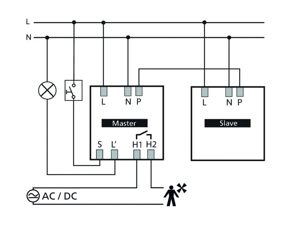 - 1 канал освещения (реле, 230 В) и 1 канал присутствия (реле, плавающее для управления HVAC)