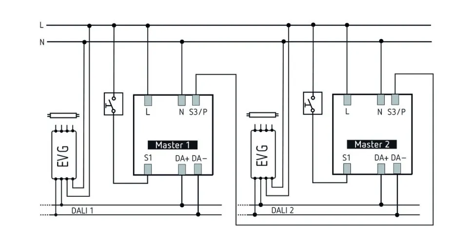 • До 10 датчиков можно подключить в режиме Master/Master или Master/Slave - для использования в больших помещениях с несколькими или одной группами освещения