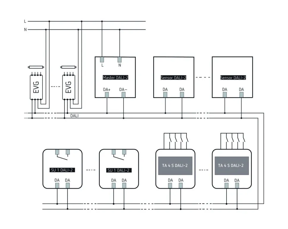 • Оценивает информацию от кнопочных интерфейсов DALI и управляет приводами, такими как ЭПРА DALI или реле DALI, в соответствии со стандартом DALI-2.
