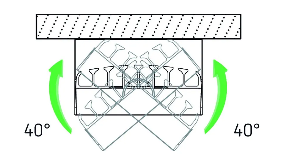 • Прожектор может быть повёрнут на ± 40° в горизонтальной плоскости; на 70° вниз; развёрнут на 180° - для освещения стены.