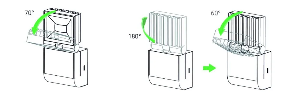 • Прожектор может быть повёрнут на ± 40° в горизонтальной плоскости; на 70° вниз; развёрнут на 180° - для освещения стены.