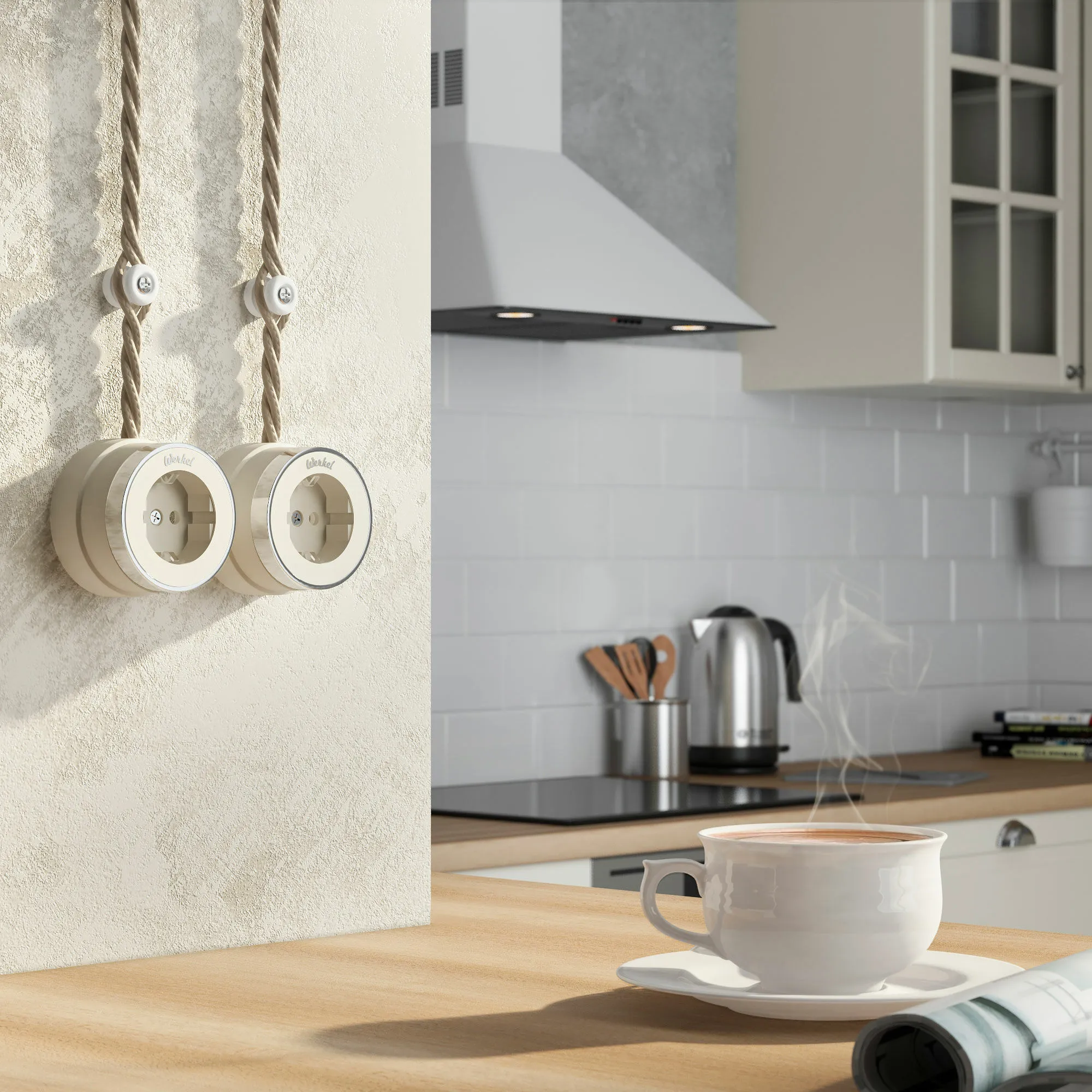 Дополнить образ помогут рамки Werkel из металла, стекла, и дерева, а так же аксессуары для накладного монтажа проводки.