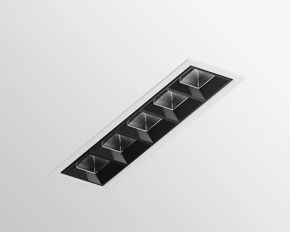 Встраиваемые светодиодные светильники Slot V x5 с декоративной рамкой. Модификации с индексом "Magic" имеют прямоугольное пятно света (асимметричное светораспределение 35°x70°).